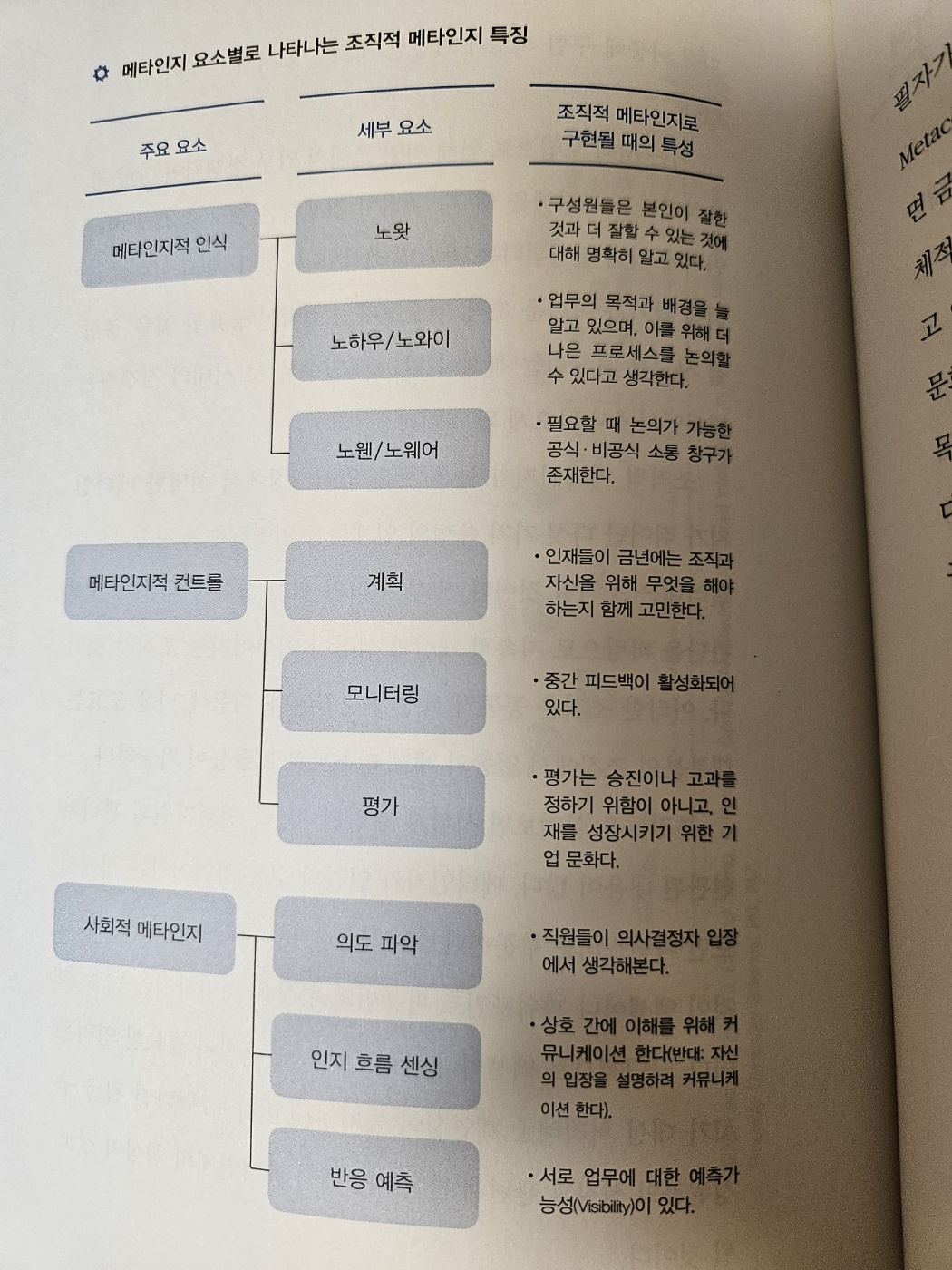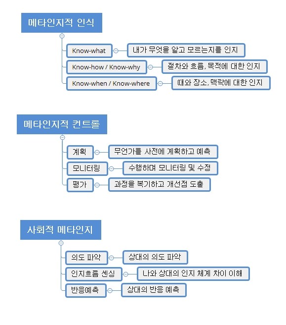 그에 따라 개념에 대한 설명도 다양한데요. 그중 업무 현장에서 의미가 있는 내용을 쉽게 설명하면 다음의 세 가지 하위 개념이 메타인지적 인식을 핵심적으로 설명한다.